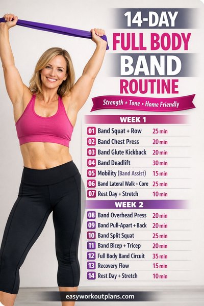 Week 1: Day 1 Squat to Press • Day 2 Single-Arm Row + Hinge • Day 3 Reverse Lunge + Curl • Day 4 Deadlift + Lateral Raise • Day 5 Mobility Flow (hips/shoulders) • Day 6 Thrusters + Core Combo • Day 7 Rest/Walk/Stretch