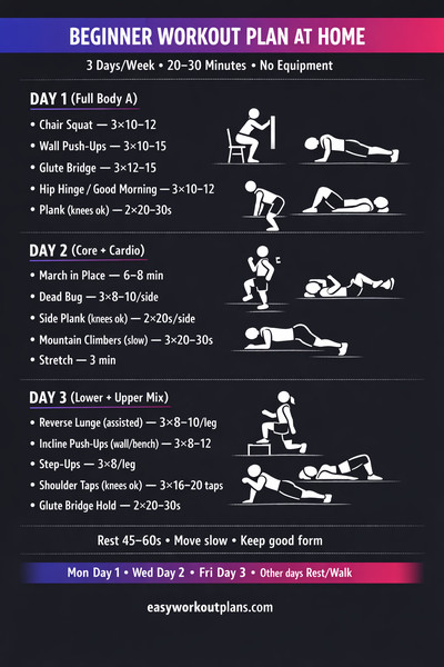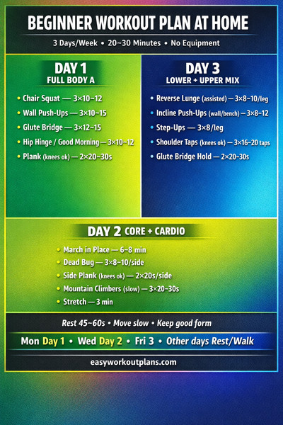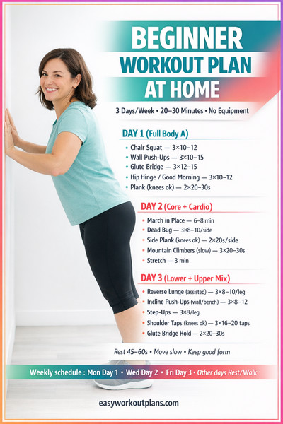 My favorite beginner rhythm is Mon: Upper, Wed: Lower, Fri: Core & Cardio. Use Tue/Thu/Sat/Sun for walking, mobility, or full rest. Remember: focus on form and take 60 seconds rest between sets.