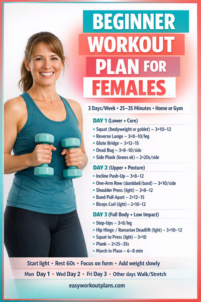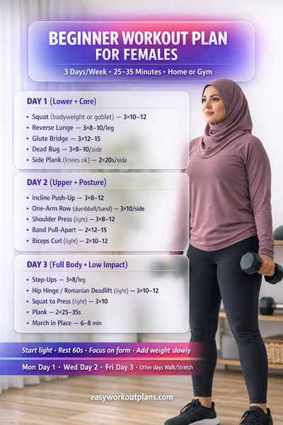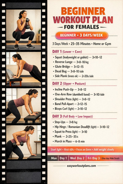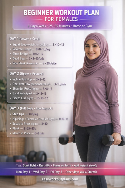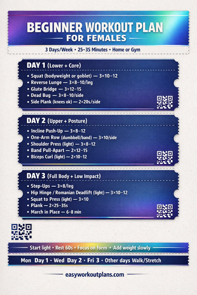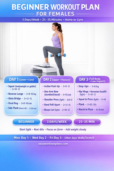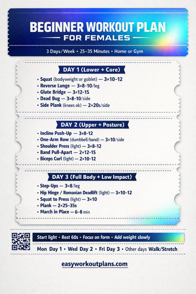 Beginner Workout Plan for Women: 3 Days per Week, 25–35 Minutes at Home or in the Gym