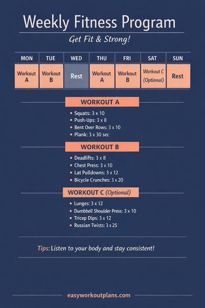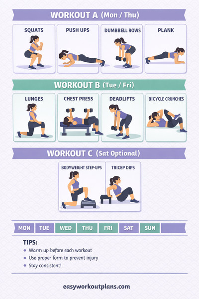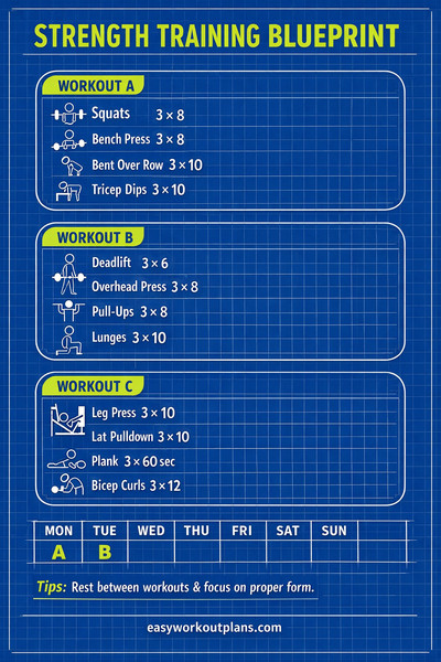 1. Set your weekly split: run Workout A (Mon), Workout B (Tue), Rest (Wed), then A (Thu), B (Fri), optional C (Sat), Rest (Sun).