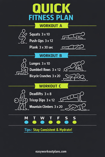 • Workout B: Lunges (3x12/leg), Plank (3x45 sec), Bicep Curls (3x12).