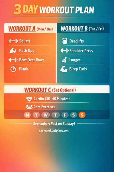 • 3-day split: Mon A, Tue B, Wed Rest, Thu A, Fri B, Sat optional C, Sun Rest.